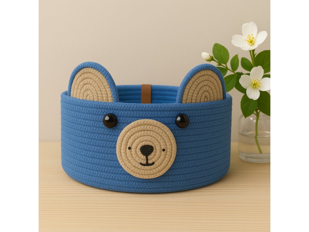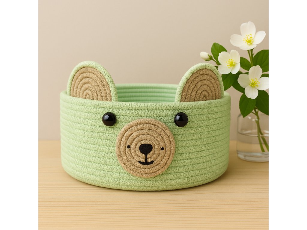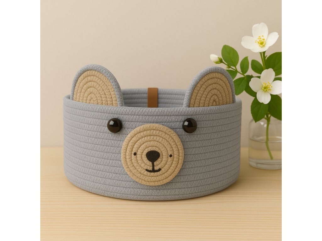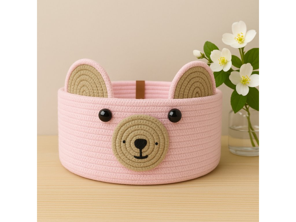 Roztomilý košíček medvídek promění každý dětský pokoj i domácnost v útulné místo. Vyrobený z pevné bavlněné šňůry, zdobený oušky a tvářičkou, je nejen originálním doplňkem, ale i úložným prostorem. Dostupný v několika barvách, aby si každý našel svého medvídka.