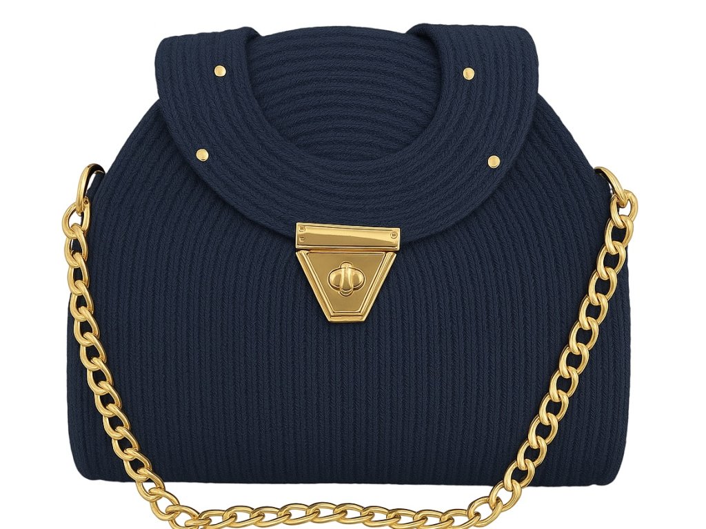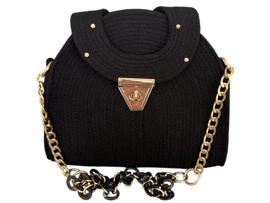 Objevte krásu s kabelkou Noir Luxe - elegantní, která dokonale propojuje nadčasový design. Vyrobená z kvalitní bavlněné šňůry, zdobená zlatým kovovým řetízkem.